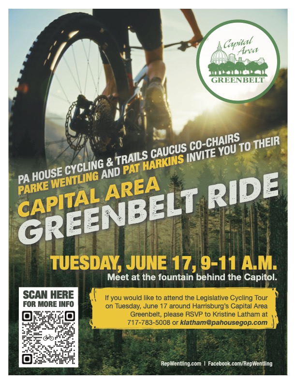 Uncategorized PA House of Representatives Bicycle Caucus Ride June 6, 2025 / Join us on a bike ride along the Capital Area Greenbelt with members of the PA House of Representatives Bicycle Caucus on June 17th at 9 a.m. Meet at the fountain on Commonwealth Ave. in back of the Capitol.